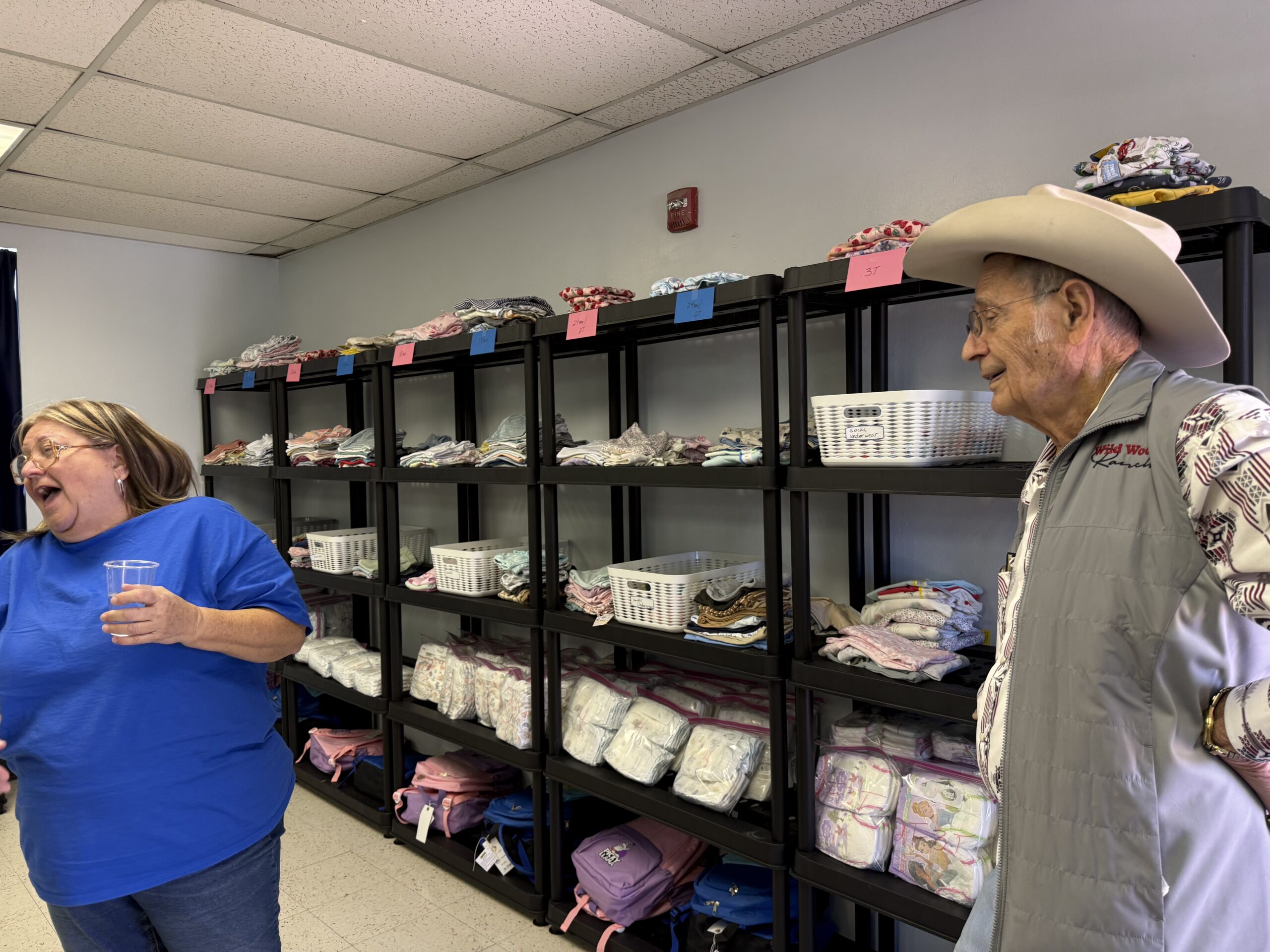 So a team formed and proceeded to convert the space with seed money provided by the El Paso district Missions team.. Old junk was cleaned up. (The room was last used as a food pantry, so you can imagine what that might have been like.) Everything was freshly painted, shelves installed and stocked with clothing from newborn to adult XXL and the hygiene needed by all those sizes. Within several weeks everything was ready and dedicated on April 15th since April is Child Abuse Prevention month. Case workers attending the opening were delighted. The goal was achieved. Needed resources were there, but the attitude of the adults having to remove these children from danger will have a better attitude. God’s love flows to all, child and adult alike.